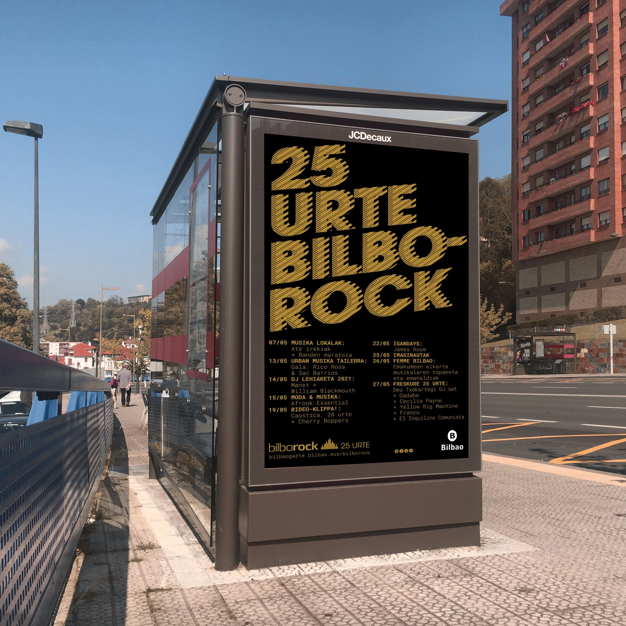 Desarrollo de gráfica para el 25 aniversario de Bilborock. Diseño de imagen para la ocasión aplicado a banderola, animaciones, banner de la web del ayuntamiento y premios otorgados a personajes que han contribuido a la trayectoria de la sala. Proyecto desarrollado en colaboración con La Machine Gráfica.